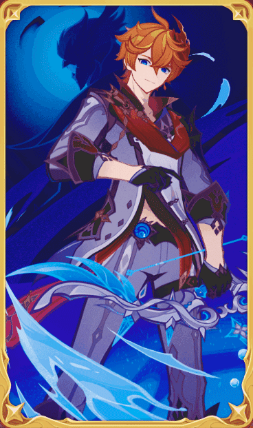 Versatile, Tartaglia has mastered nearly all types available in Teyvat and found in the depths of the Abyss.Still, he shows preference for those allowing for agile strifes and will be seen frequently in use: swords, polearms and, more notoriously, Hydro dual blades.With the exception of the Polar Star, the bow gifted to him by the Tsaritsa herself upon ascension to the rank of Harbinger, every weapon used in battle is made of raw elemental energy, summoned from his own mastery of the elements (Hydro and/or Electro) and carrying their particular properties.
